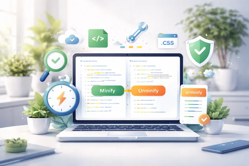 CSS minify reduces the size of a stylesheet by removing unnecessary characters, while CSS unminify restores the code into a readable structure with proper spacing and formatting. Both processes are essential for optimizing performance and maintaining code during development and debugging.